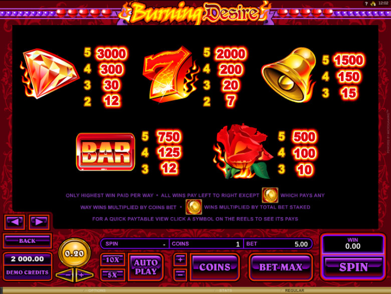 Burning Desire online slot is extremely easy to play but it’s always best to take a look at the paytable before you play slots online. Click ‘View Pays’ beneath the leftmost reel to see the values of each prize symbol and learn how the special features work. You can also click any of the symbols on the reels to view its respective pays.