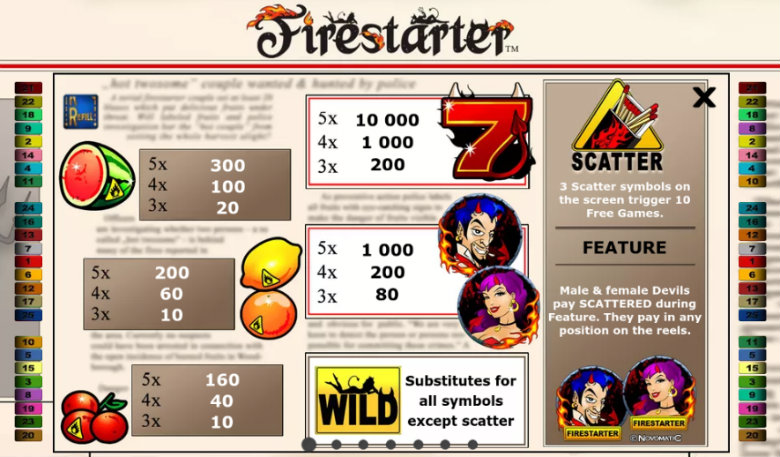 It’s really easy to play Firestarter slot but you should click on ‘Paytable’ before spinning the reels. Here you can see the values of each prize symbol and how the bet lines are mapped. There is also information on how the features work and you can read the game rules.