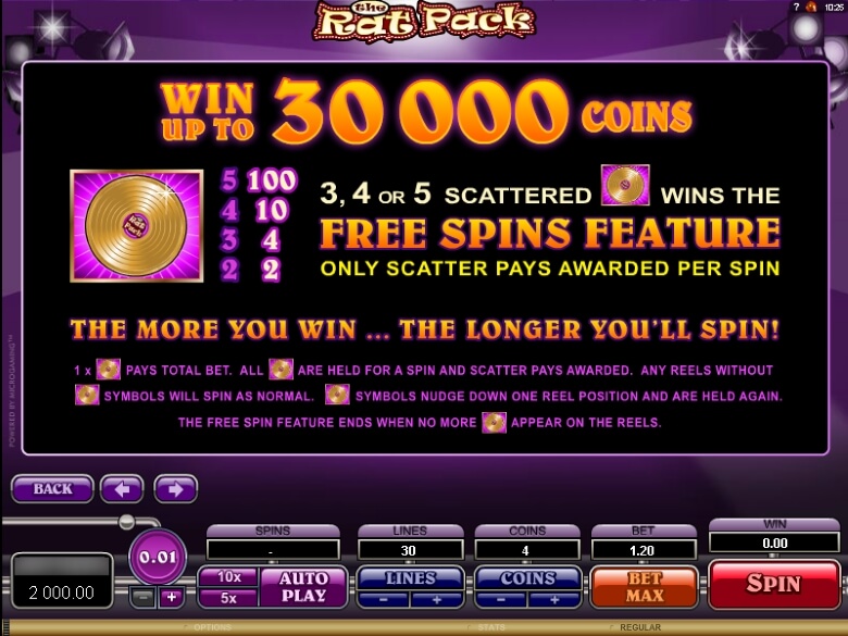 The Rat Pack slot by Microgaming is a 5-reel and 4-row video slot with 30 pay lines. These are not fixed which means you can choose how many pay lines you would like active. The game includes a x2 wild multiplier that can substitute all symbols apart from the scatter symbol. There is also a second standard wild symbol. The scatter can activate a unique free spins bonus round where as long as you keep winning you keep spinning. The Rat Pack video slot has a top jackpot prize of £7,500.